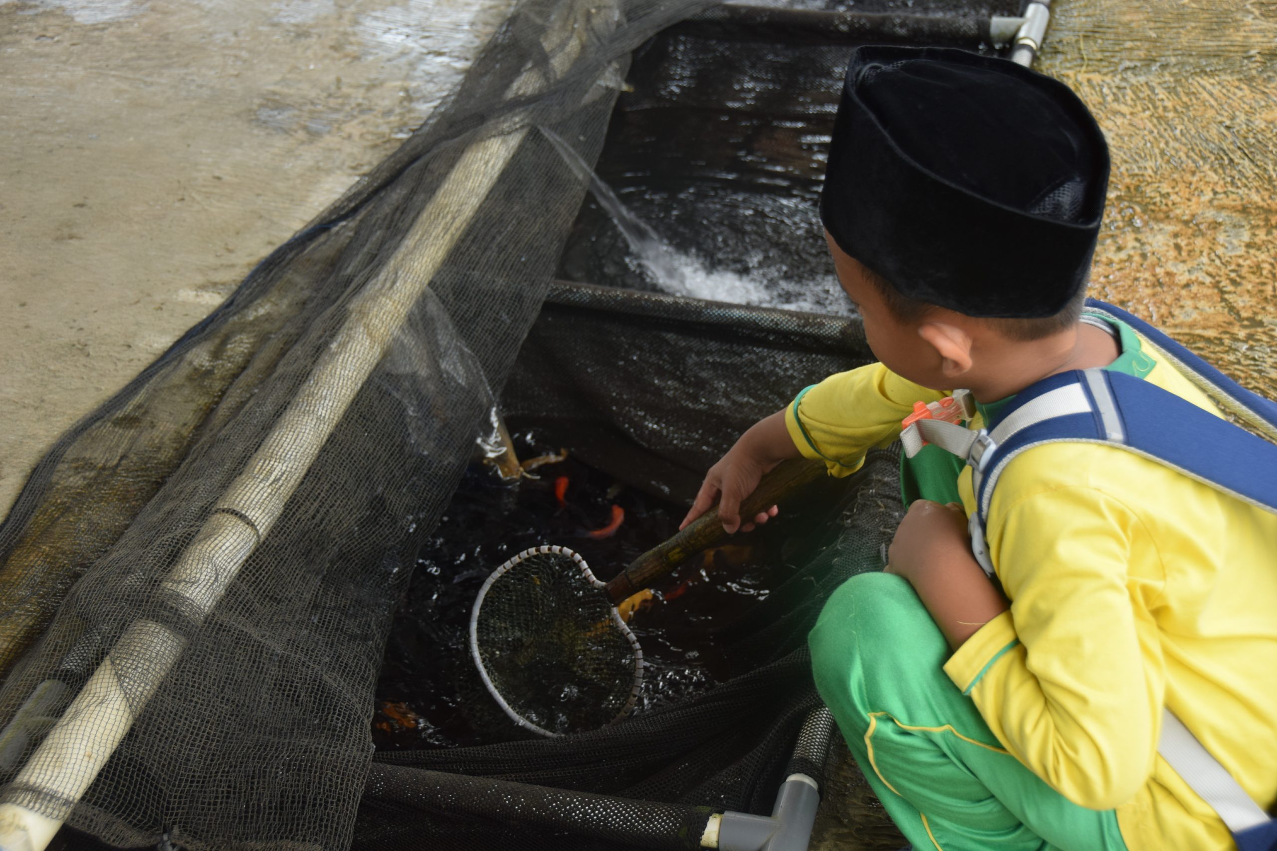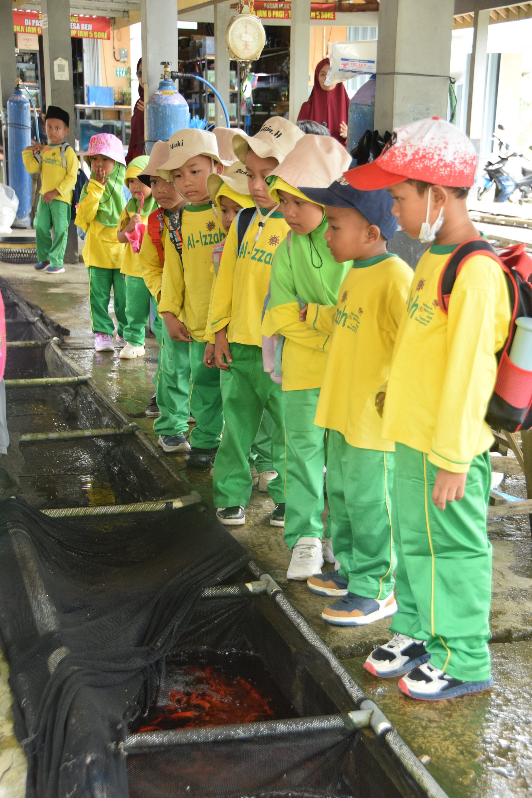 Tepat pukul 10.00, para ustadzah mulai mengarahkan anak-anak untuk bersiap naik angkot yang telah datang dan menunggu di halaman sekolah. Sesampainya di Pasar Ikan Beji, anak-anak diajak melihat berbagai kolam ikan berukuran kecil maupun besar. Mereka tampak takjub melihat begitu banyak jenis ikan yang dipelihara di sana. Ikan-ikan yang ada terdiri dari ikan air tawar baik untuk benih maupun konsumsi, seperti mujair, bawal, melem, tawes, lele, gurame, serta beragam jenis ikan hias. Anak-anak mendapatkan penjelasan langsung dari koordinator pasar mengenai jenis-jenis ikan tersebut dan bagaimana cara perawatannya. Setelah sesi penjelasan selesai, anak-anak diajak berkeliling untuk melihat lebih dekat berbagai jenis ikan yang ada di sana.
