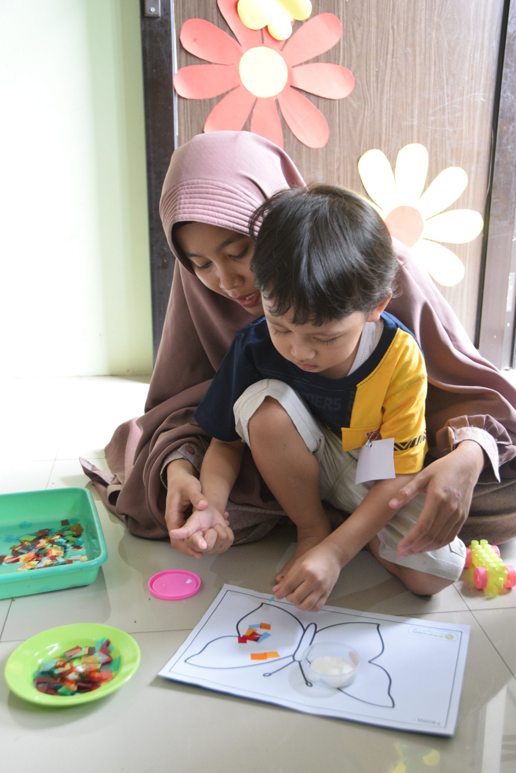 Kegiatan inti dimulai dengan menempel plastik warna-warni ke gambar kupu-kupu, membangun kreativitas sekaligus melatih motorik halus. Namun momen yang paling membuat anak-anak bersorak adalah tantangan “mencari sayap kupu-kupu yang hilang.” Ustadzah telah menyiapkan satu sisi sayap, dan tugas anak adalah mencari pasangannya sesuai warna dan posisinya. Aktivitas ini tidak hanya seru tetapi juga melatih ketelitian, keberanian, dan kemampuan memecahkan masalah.